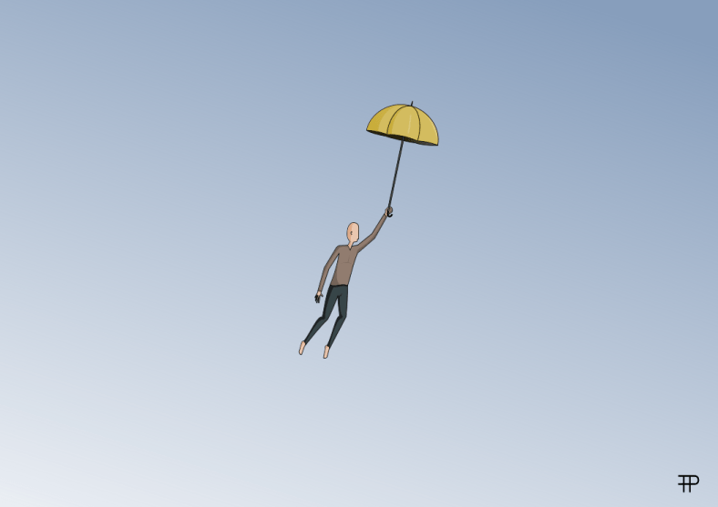 En el encierro, todos compartimos el mismo sueño de salir a la calle un día soleado, abrir el paraguas y elevarnos sutilmente impulsados por una corriente de aire caliente. Ese día llegará, tarde o temprano. Cuidado con los buitres al subir.