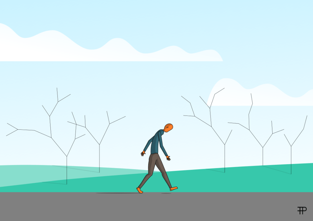 Hay quienes caminan mirándose a los pies. Se levantan de la silla y al mismo tiempo que dan el primer paso orientan su mirada hacia la tierra, al lugar en el que plantarán su pisada. Normalmente, las cosas ocurren por encima del suelo, a otros niveles; el suelo solo nos sustenta. Nos mantenemos pegados a él gracias a una poderosa fuerza invisible llamada gravedad, y sobre él construimos edificios, carreteras, fábricas, parques. Caminar mirándose a los pies es como mirarse al ombligo. Creo que tiene algo que ver con la inseguridad y al mismo tiempo con el ego. Mirarse a los pies es mirarse a uno mismo mientras se avanza sin que nada más importe, pero también es no querer salir de la concha; el miedo a ser devorados en el exterior nos lleva a devorarnos a nosotros mismos.