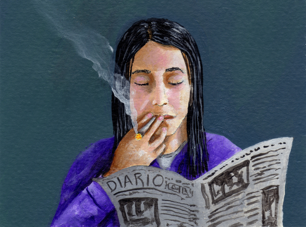 Aquí cerca del estudio, a unos cuantos edificios, tiene la redacción «El Diario de Arousa». Cuando paso por ahí, de ida o de vuelta, a veces hay una periodista recargada en una de las columnas de la entrada del edificio, donde se encuentra su periódico. Con una mano sostiene un cigarro y con la otra, hojas impresas, supongo que con lo recién escrito. Es decir, ella baja un momento de su oficina a fumarse un cigarro, y aprovecha el tiempo para seguir trabajando. Mira esas hojas con mucha atención, como repasando cosas en su mente, se le ve la pasión por el oficio. Me resulta fascinante y me conmueve su labor de narrar así, lo que sucede aquí cerca, lo cotidiano. Pero al verla, no dejo de pensar, que su profesión en otra geografía sería muy peligrosa.