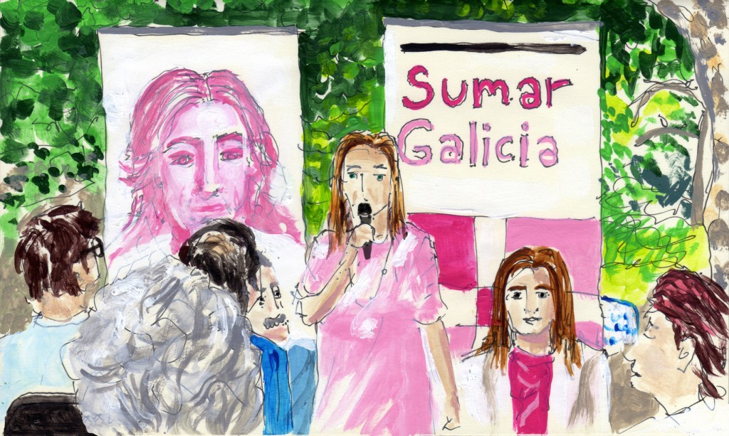 Fui al mitin que hicieron aquí en Vilagarcía, el pueblo donde vivo, estuvieron Verónica M. Barbero, Verónica Hermida y Fernando Ríos. El lugar elegido fue el parque de Ravella, un lindo espacio entre plátanos centenarios que nos daban sombra y frescura. Había pocas sillas, y menos gente aún. Faltaba poco tiempo para que empezara y cada minuto que pasaba se acercaban más personas, de todas las edades, así que las sillas fueron insuficientes, rápido la gente de SUMAR fue por más sillas. Incluso el extra que trajeron fue insuficiente, la gente se sentó en los bancos del parque y el resto se quedó de pie. Me dio mucho gusto estar ahí y ver lo que sucedió, porque se sobrepasaron las expectativas y se cuadruplicó la gente que asistimos.