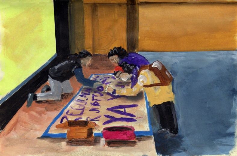 Al finalizar la charla, hicimos algunas pancartas y carteles, para después caminar manifestándonos con consignas de celebración, hasta la Plaza de Cervantes en el centro de Santiago, me conmovió ver que la gente salía a sus balcones a aplaudirnos o salían de los locales comerciales a unirse a la celebración. Contamos con la maravillosa ayuda de «Somdolilá» y «Tamborililás» batucadas transfeministas que animaron y reivindicaron el espacio. En la plaza se leyó un manifiesto muy sentido. Después nos fuimos a comer deliciosas preparaciones peruanas, por la noche, al terminar el Ramadán se cenó comida senegalesa.